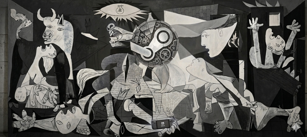 (Imagen generada con inteligencia artificial haciendo uso del cuadro “Guernica” de Pablo Picasso y el logotipo de Steam plataforma de Valve. Al tratarse de una columna de recuento o de opinión, se suele permitir el uso de imágenes protegidas mientras no se tengan fines comerciales o no se esté intentando percibir como una asociación o endorsement de la empresa Valve).